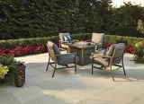 This patio chat set includes a loveseat, two club chairs, a fire table, and a propane.