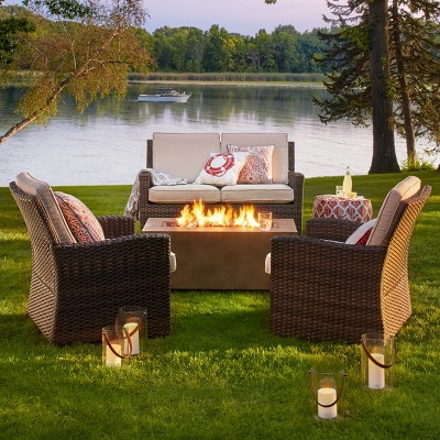 Round fire table set with four deep seating swivel rocking chairs, wind blocker, fire beads, lid and fabric cover. Sego lily kanab 4 piece fire pit conversation set. Patio furniture patio furniture sets sofas, chairs & sectionals dining sets dining tables dining chairs coffee & side tables chaise lounges adirondack chairs hammocks & swings outdoor decor fire pits outdoor rugs doormats outdoor lighting garden accents outdoor curtains & shades outdoor cushions & pillows planters, hangers & stands patio. 4.0 out of 5 stars. 50000 btu square concrete propane backyard patio furniture outdoor fire pits pablo modern 42 in.